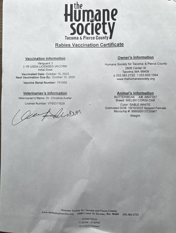 She was lost in Tacoma and brought to the Tacoma-Pierce County Human Society. Thanks to the chip I put in my pups before the go home, I was contacted to find her owner by AKC.
